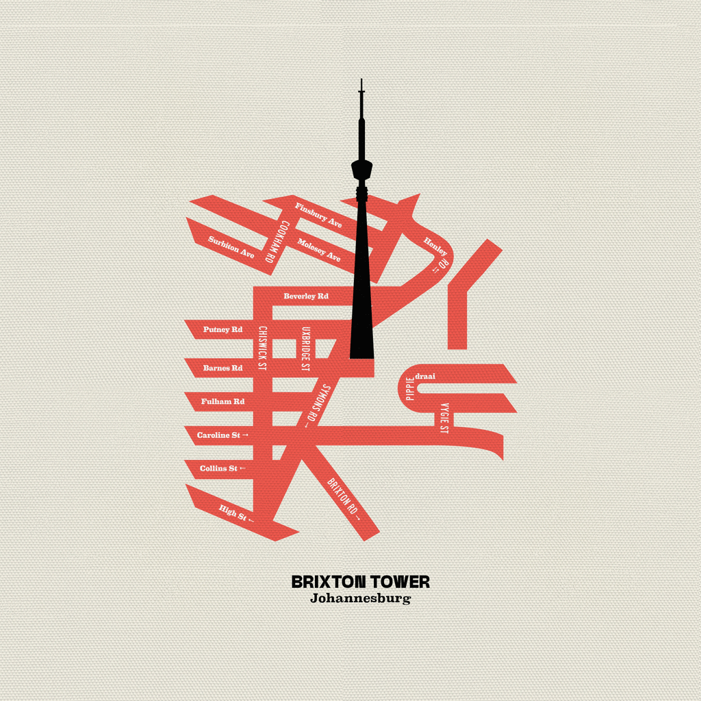 This set of graphics of the areas around Johannesburg's iconic Telkom Tower in Hillbrow, and Sentech Tower in Brixton, return to life in coral and black on a double-sided tote bag.