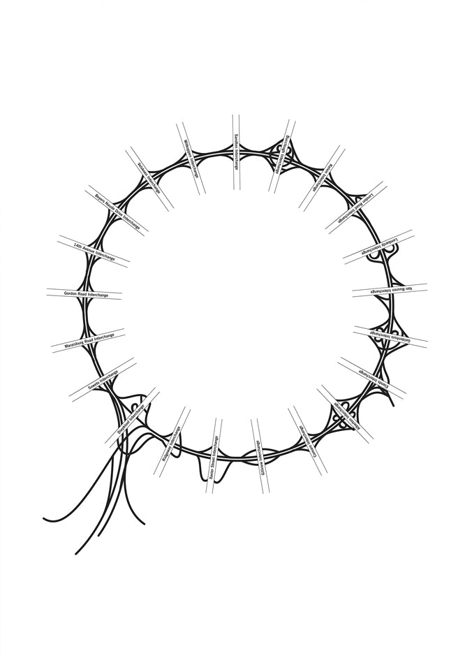 A stylised version of Johannesburg's Ring Road, highlighting the interchanges that connect the M1, M2, N1, N3 and N12 around the city.