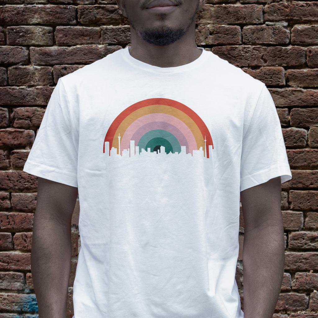The Love Jozi Skyline silhouetted against a rainbow in a rich and warm colour palette.